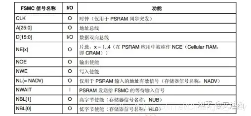 本例程中使用的是FSMC的NOR/PSRAM存储器控制器部分,即把TFTLCD当成SRAM设备使用。NOR/PSRAM存储器控制器的接口信号功能如下图示: