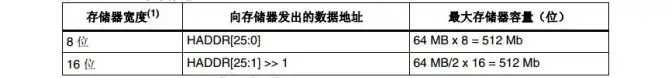 本例程使用的是Bank1的第4区,即起始地址为0x6C000000,这里需要特别注意HADDR[25:0],HADDR[25:0]包含外部存储器地址,由于HADDR为字节地址,而存储器按字寻址,所以根据存储器数据宽度不同,实际向存储器发送的地址也有所不同,如下图示: