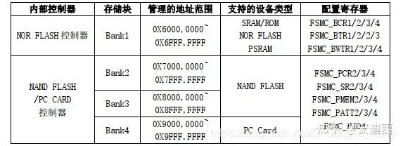 Bank1可连接多达4个NOR Flash或PSRAM存储器器件,此存储区域被划分为4个NOR/PSRAM区域,带4个专用片选信号;Bank2和Bank3用于连接NAND Flash器件;Bank4用于连接PC卡设备;对于每个存储区域,所要使用的存储器类型有用户在配置寄存器中定义。FSMC各Bank配置寄存器如下图示: