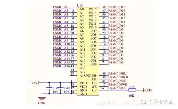 从电路图中可以看到IS62WV12816和STM32F1的连接线路: A0 ~ A16连接在FSMC_A0 ~ FSMC_A16上(连接顺序可以打乱,因为地址是固定的) I/O0 ~ I/O15连接在FSMC_D0 ~ FSMC_D15上(连接顺序不能打乱,否则读写数据将出错) UB和LB连接在FSMC_NBL1 和 FSMC_NBL0上 OE和WE分别连接在FSMC_NOE 和 FSMC_NWE上 CE连接在FSMC_NE3上