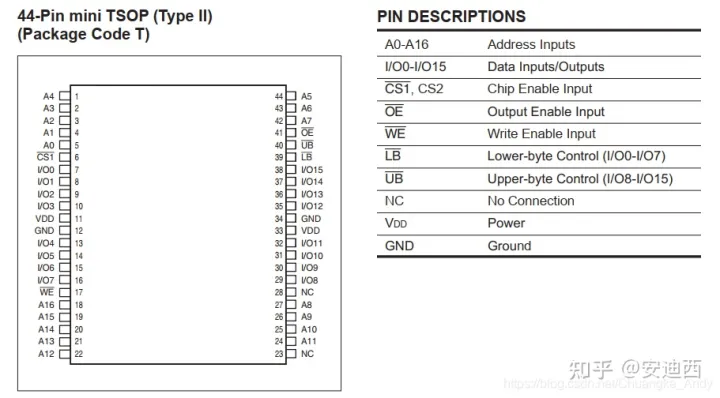 A0 ~ A16为地址线,总共17根地址线(可访问 217 = 128K字节空间);I/O0 ~ I/O15为数据线,总共16根数据线;CS1(低电平有效)和CS2(高电平有效)都是片选信号;WE为输入使能信号(写信号);OE为输出使能信号(读信号);UB和LB分别是高字节和低字节控制信号