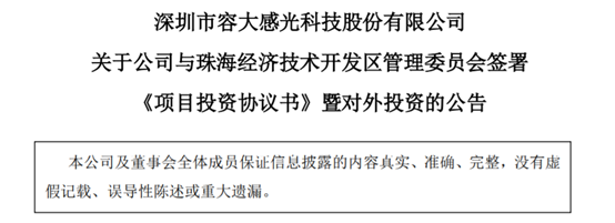 公告显示,容大感光于2021年9月27日召开第四届董事会第九次会议及第四届监事会第七次会议,审议通过了《关于公司与珠海经济技术开发区管理委员会签署暨对外投资议案》,公司独立董事发表了同意意见。根据《深圳证券交易所创业板股票上市规则》、《公司章程》等相关规定,本次投资事项尚需提交公司2021年第二次临时股东大会审议批准。