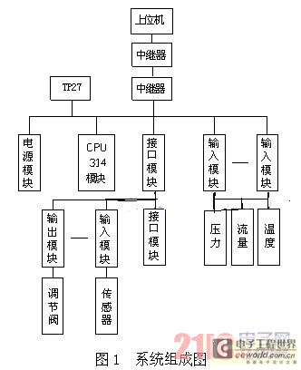 PLC采用Siemens公司生产的S7-300系列,由于现场的PLC系统与主控室的上位机距离较远(800米左右),因此通讯系统需成对加装RS-485中继器,另外在现场增加TP27-10//触摸屏进行数据显示,确保系统运行的稳定性。系统组成如图1所示。