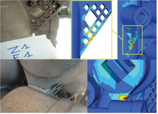 Simufact Additive允许识别在制造阶段和后处理操作过程中由于零件变形、与刮刀碰撞的风险以及零件本身或与零件相连的支撑结构打印可能的增材缺陷而产生的潜在问题。下图说明了增材制造过程中可能发生的故障:3D打印机刮刀/工件在制造过程中与粉末层发生碰撞,以及在3D打印过程中由于制造过程中零件的固有应力而导致的大规模裂纹形成。