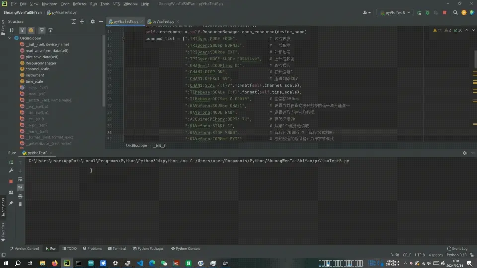 (1)使用Python的pyvisa库,以及优利德支持的SCPI协议,控制示波器。