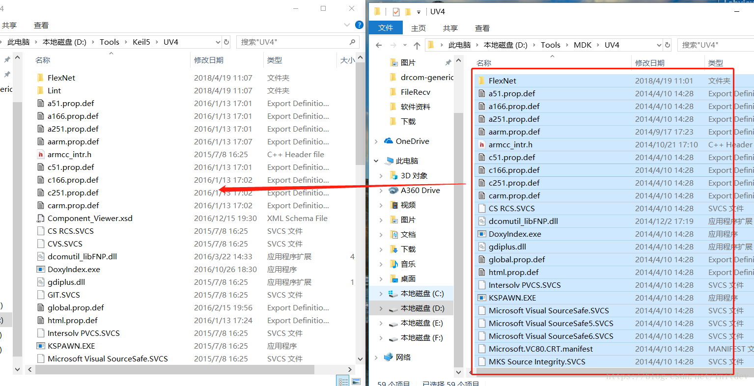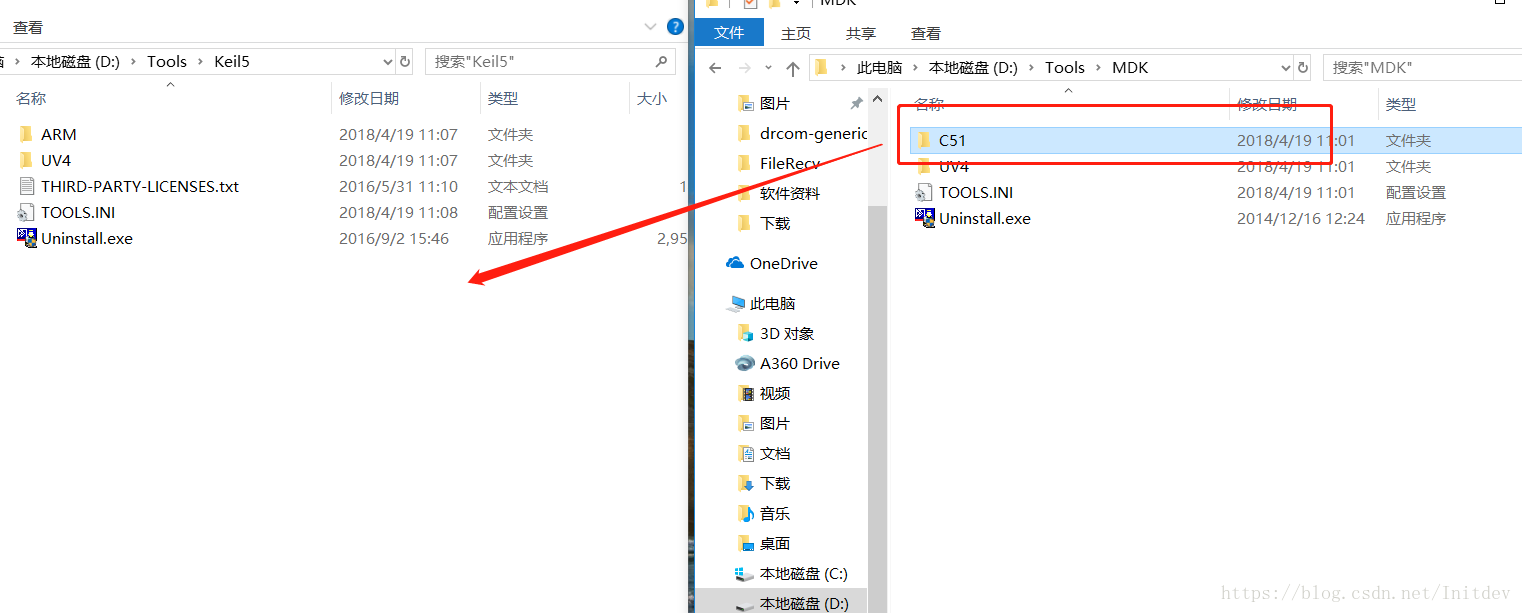 下面开始共存的操作,首先打开C51的安装目录和MDK的安装目录,把C51目录下的C51文件夹整个复制到MDK目录下。