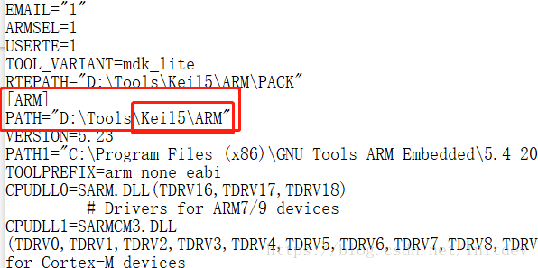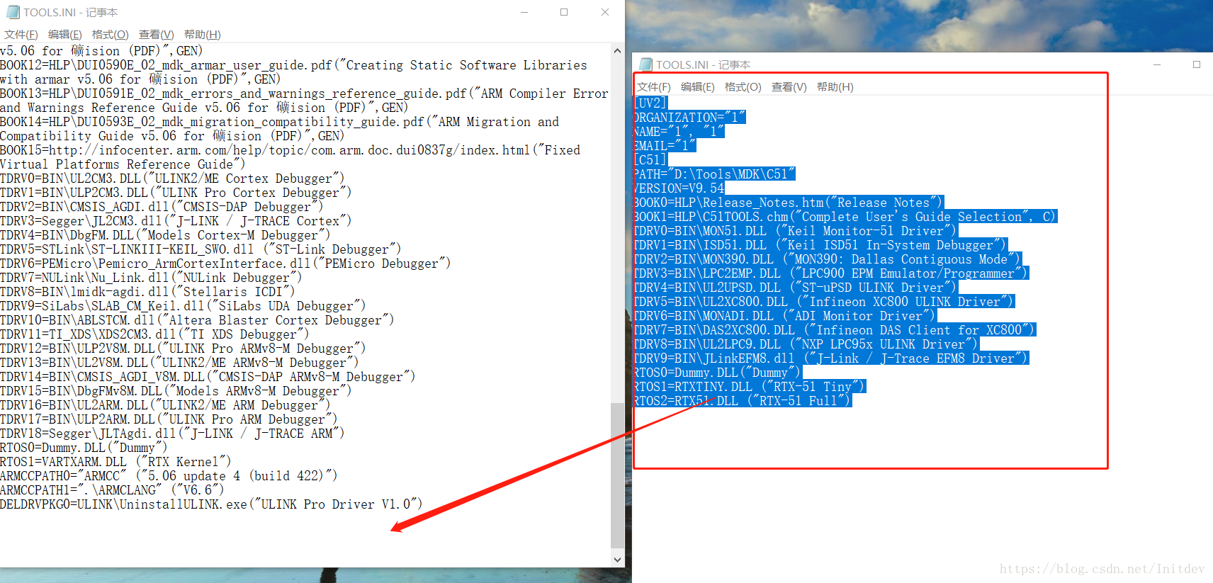 然后打开C51目录下的TOOLS.INI,Ctrl+A选中全部文件,然后Ctrl+C复制,打开MDK目录下的TOOLS.INI,在到最后一行Ctrl+V粘贴。