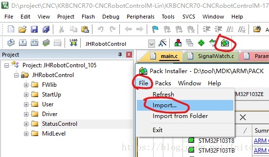 在点击Import...选择下载好的几个stm32的pack,然后就会自动安装了。安装完成后关闭Pack Installer界面即可。