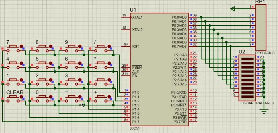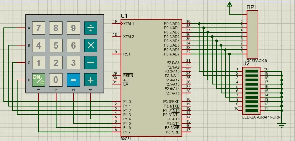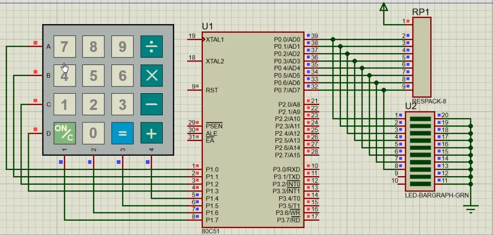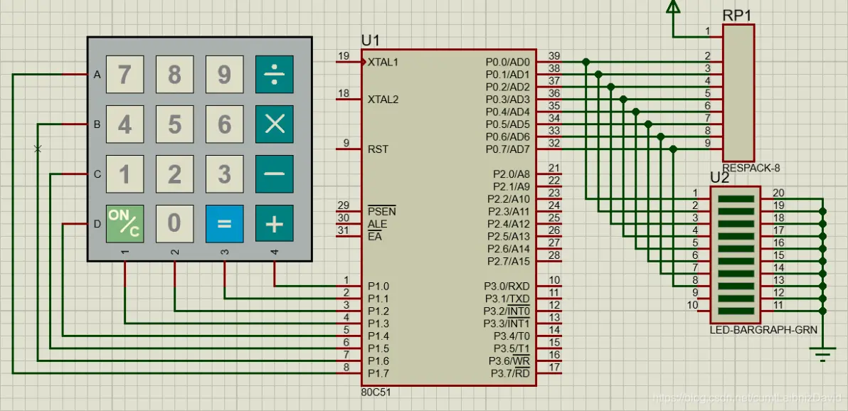一开始,我以为可以按照逐行扫描法时一样的电路进行操作。所以选择的硬件都没变:Keypad-Smallcalc(键盘),80C51(芯片),Respack(排阻),Led-Bargraph-GRN(Led)以及电源端和接地端。所用到的原件如图:
