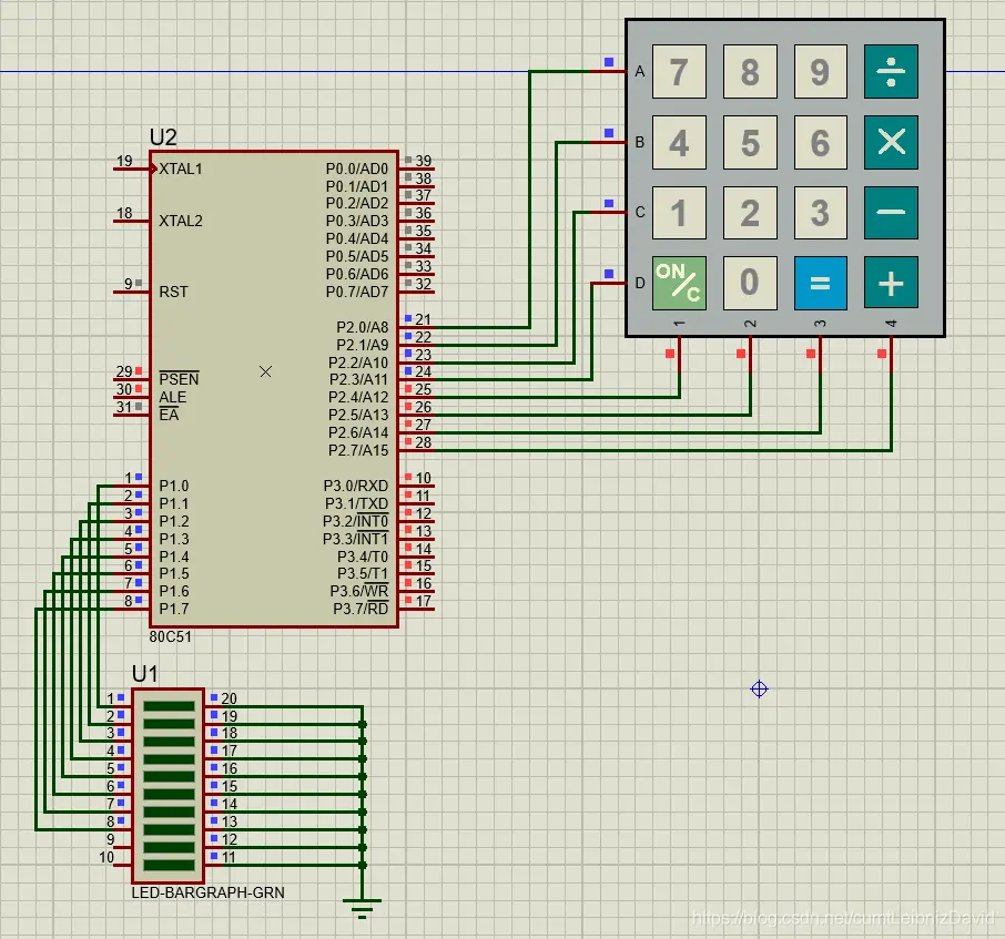 可见,我们的键盘连接了P2端口,低4位为行,高四位为列,LED则连接的P1端口。以此为例。