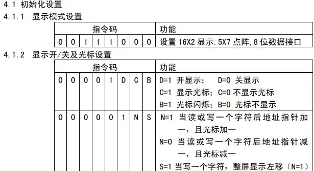 让液晶显示字符,首先对其进行初始化设置:对有、无光标、光标移动方向、光标是否闪烁及字符移动方向等进行设置。而对LCD1602的初始化、读、写光标设置、显示数据的指针设置等,都是单片机向LCD1602写入命令字来实现。命令字见下表。
