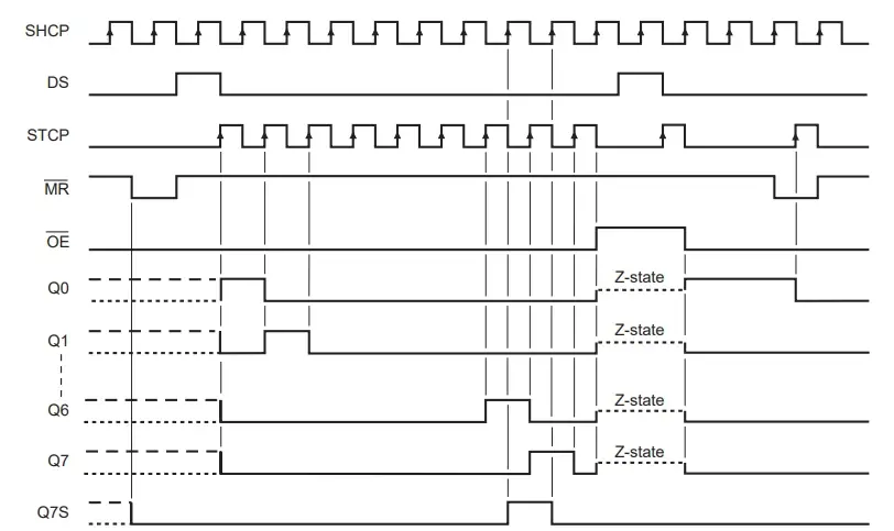 STCP = 1; //先等0,后等1,595接收到上升沿之后,会自动将移位寄存器数据锁存到锁存器中并输出