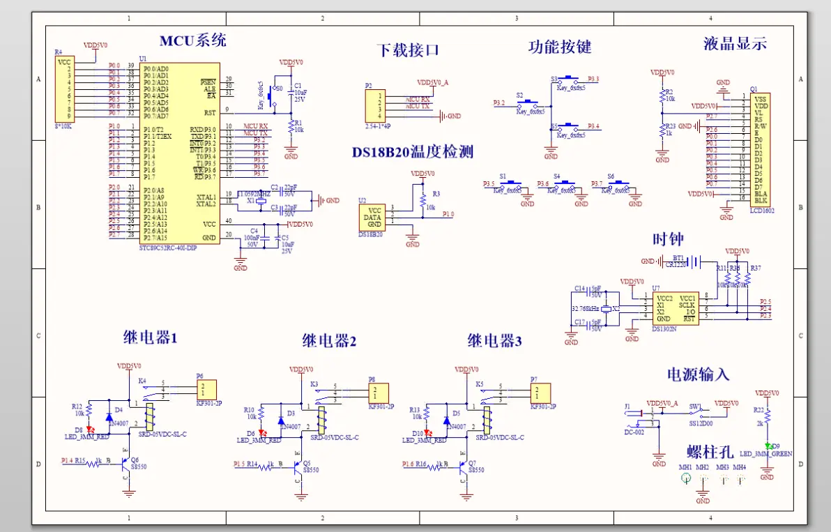 功能介绍:0.本系统采用STC89C52作为单片机1.系统实时显示当前的日期/时间,循环显示当前的温度/继电器控制状态2.按键可设定温度,可控制继电器开关,系统设置了三路继电器,可以分别控制三种不同的家用设备3.温度传感器采用的型号是常见的DS18B20,该传感器精度和测温范围都良好4.采用DC002作为电源接口可直接输入5V给整个系统供电