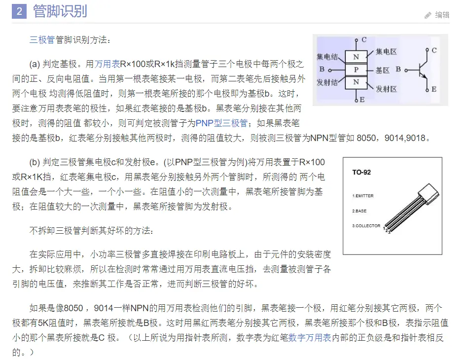 虽然型号不同,但是原理是一样的。我们先介绍三极管的三个管脚,左侧横着的是B极,叫做基极,带箭头的那一级叫做E极,发射极,剩下的就是集电极,C极。这里只介绍三极管的开关作用:有一个简单记的方法,就是当电流可以顺利通过箭头指向是就是导通的,否则就是截止的状态。以PNP型为例:假设将E极接一个VCC,B极接单片机引脚,此时单片机引脚为高电平,假设电流从VCC流出来,但是有一个问题,B级也是5V,这就好比河流一样高,电流就流不动了,所以此时是截止状态,不会有电流输出。那单片机引脚是低电平呢?低电平相当于接地,电流可以顺利流过去,此时三极管是导通的。NPN型三极管也是同样的道理。原理图懂了,但是实物图都长的一样,该如何分辨这三个管脚呢?如果知道三极管的型号可以直接查阅相关资料,在不知道三极管的型号的情况下,我们需要用到万用表,这里建议使用数字万用表,万用表测量的原理和三极管导通的原理是一样的,想了解具体步骤请自行百度(UP猪太懒了),直接上图吧。