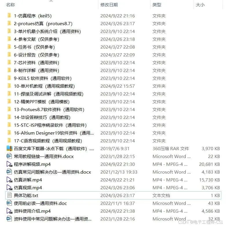全部资料包括程序(keil5)、protues仿真(protues8.7)、开发资料、资料使用介绍、仿真视频、程序讲解视频、仿真讲解视频、最小系统介绍视频等。