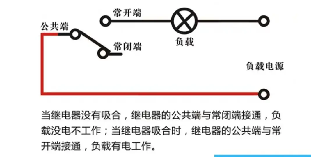 如图所示,单路继电器的本质就是一个单刀双掷开关,在触点未吸合时公共端与常闭端连接,当触点吸合时,公共端与常开端连接在一起。电路导通,负载开始工作。