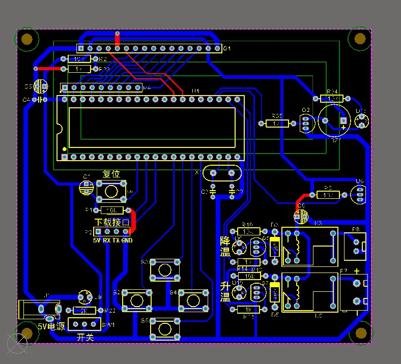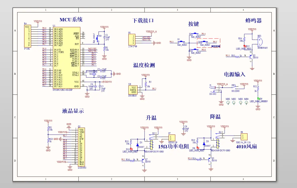 功能介绍: 0.本系统采用STC89C52作为单片机 1.LCD1602液晶实时显示当前温度及温度范围设定 2.超过温度设定范围将启动加热棒加热或风扇冷却 3.超过设定温度将声光报警 4.按键可设置温度范围 5.采用DC002作为电源接口可直接输入5V给整个系统供电