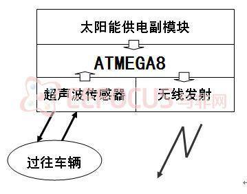 设计中各个部分的作用为:① ATMEGA8负控制超声波传感器和无线发射的工作状态;② 无线发射用于向主控模块发送车辆检测信号;③ 超声波传感器向外发射超声波,遇到障碍物时返回;④ 太阳能供电副模块负责为该部分提供能源。