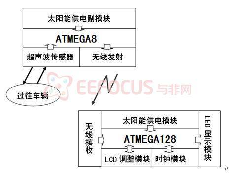 如图1所示为该系统结构框图。由框图可以看出该系统可以分为上下两个部分:① 上半部分由太阳能供电副模块、ATMEGA8、超声波传感器和无线发射组成,整个上半部分合称为超声波检测模块;② 下半部分由ATMEGA128、无线接收、太阳能供电模块、LED显示模块、LCD调整模块和时钟模块组成,整个下半部分合称为主控模块。