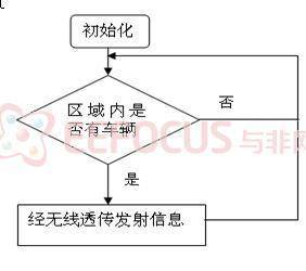如图5所示为该系统超声波检测模块程序流程图。上电之后进行初始化操作,包括ATMEGA8定时器和中断的初始化、超声波传感器和无线发射工作状态的初始化。之后主程序开始运行,超声波传感器不间断的向外发射超声波,当接收到返回信号时变触发中断,在中断中统计此次发射与接收的时间,若采样的时间变短则表示区域内有车,此时通过程序将信息写入无线发射,经无线发射将信息发送至主控模块,否则继续对区域内的车辆进行检测。