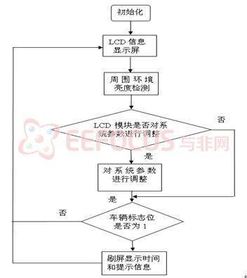 在该系统中采用了两种型号的单片机,ATMEGA128作为主控模块的单片机而ATMEGA8作为超声波检测模块的单片机。在主控模块中,软件模块主要包括初始化、LCD屏显信息、周围环境亮度检测、LCD调整模块系统参数设定以及LED刷屏显示五个部分组成;在超声波检测模块中,软件模块主要包括初始化和区域内车辆检测两个模块。