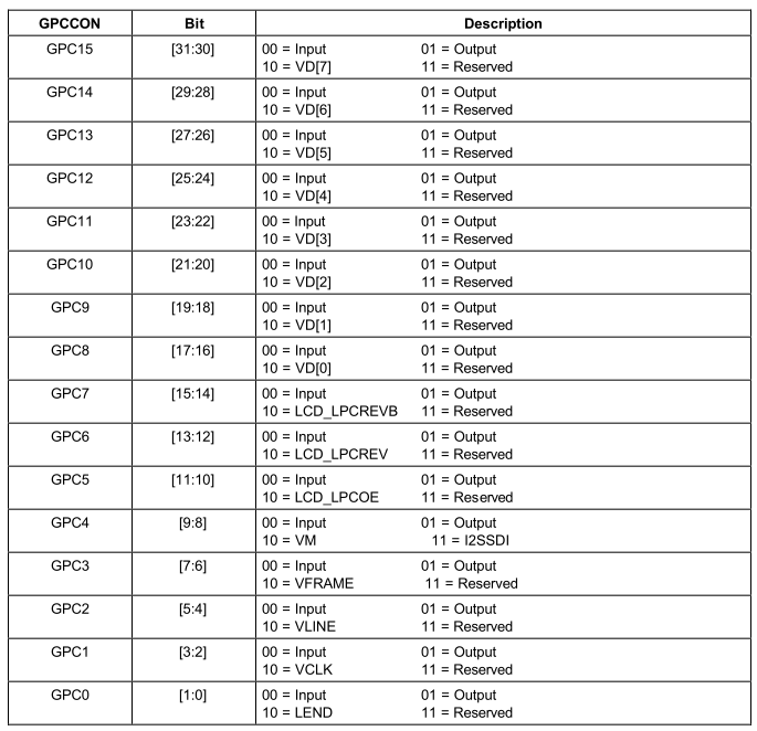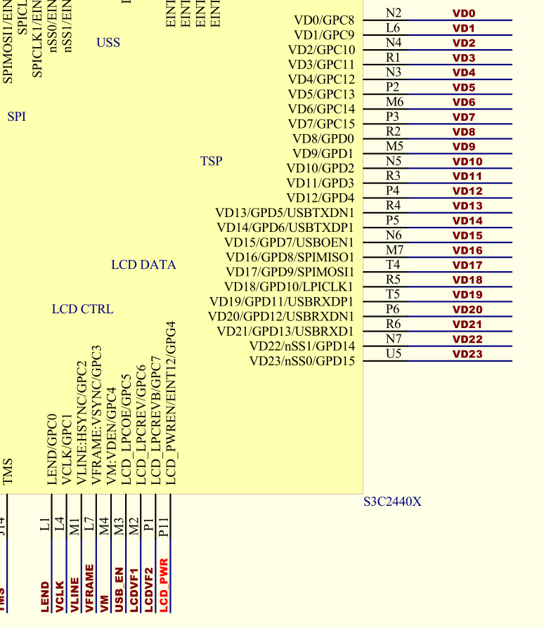 参照下图:VSYNC/VFRAME/STV:垂直同步信号(TFT)/帧同步信号(STN)/SEC TFT信号; HSYNC/VLINE/CPV:水平同步信号(TFT)/行同步脉冲信号(STN)/SEC TFT信号; VCLK/LCD_HCLK:象素时钟信号(TFT/STN)/SEC 参照TFT信号; VD[23:0]:LCD像素数据输出端口(TFT/STN/SEC TFT); VDEN/VM/TP:数据使能信号(TFT)/LCD驱动交流偏置信号(STN)/SEC TFT 信号; LEND/STH:行结束信号(TFT)/SEC TFT信号; LCD_LPCOE:SEC TFT OE信号; LCD_LPCREV:SEC TFT REV信号; LCD_LPCREVB:SEC TFT REVB信号;