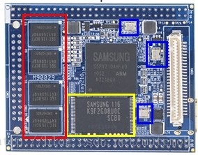 Tiny210(S5PV210)上蓝色的框标注的就是晶振的位置,最上面的是27MHz,中间和下面两颗是24MHz,顺便讲一下另外几片东西,最左边的四片是内存DDR2-800,这表示数据传输频率为800MHz,外部时钟频率200MHz,内部时钟频率为100MHz;下面的黄色框是NAND FLASH,外部时钟频率133MHz。
