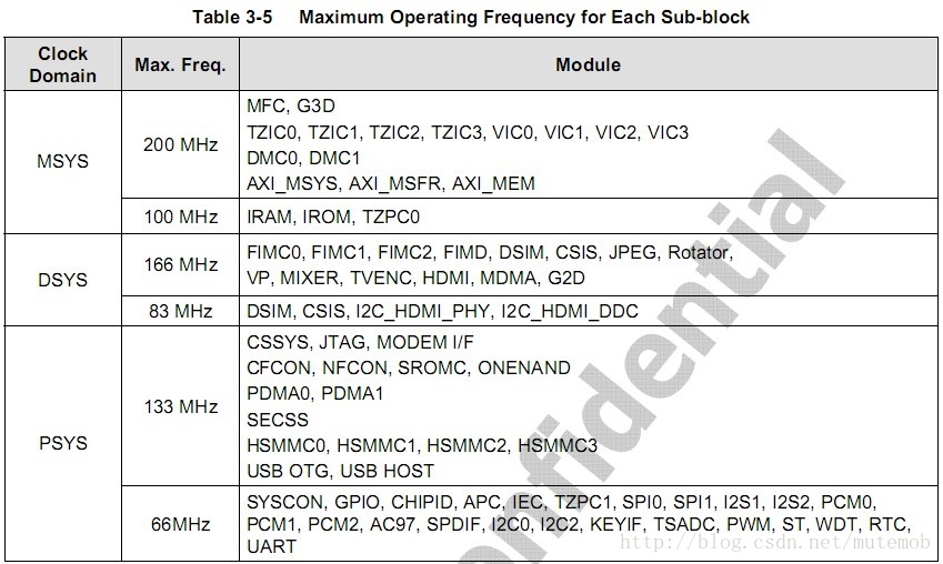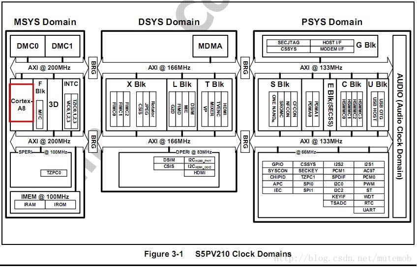 S5PV210的Clock分为三个domain,意思是三个区域-- MSYS,DSYS,PSYS,这三个区域分别都是AMBA总线,AMBA总线分为AHB和APB两种总线(这是不严格的分法,仅仅是便于理解),每种总线都有不同的时钟频率,AHB--HCLK/APB--PCLK