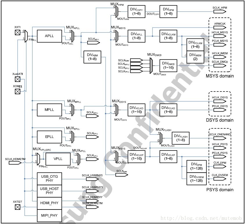 有四种PLLs(APLL,MPLL,EPLL,HPLL),还包括USB_OTG PHY clock。