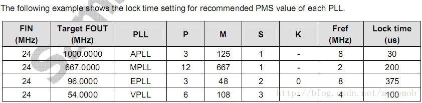 由芯片手册上显示APLL的lock time是30us,如果是晶振输出的频率是24MHZ,lock time是30毫秒,那么PLL_LOCKTIME是720,也就是 0x2D0。OK,下一篇开始结合u-boot的源码来分析如何配置系统时钟。