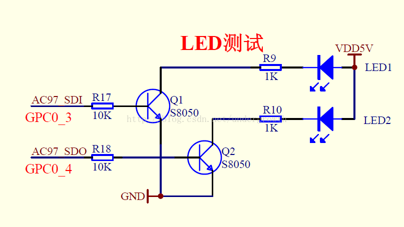 废话不多说 先看硬件电路图 很简单 通过NPN三极管控制LED的阴极 NPN三极管的基极给高电平 则三级管导通 则LED等点亮 反之则熄灭
