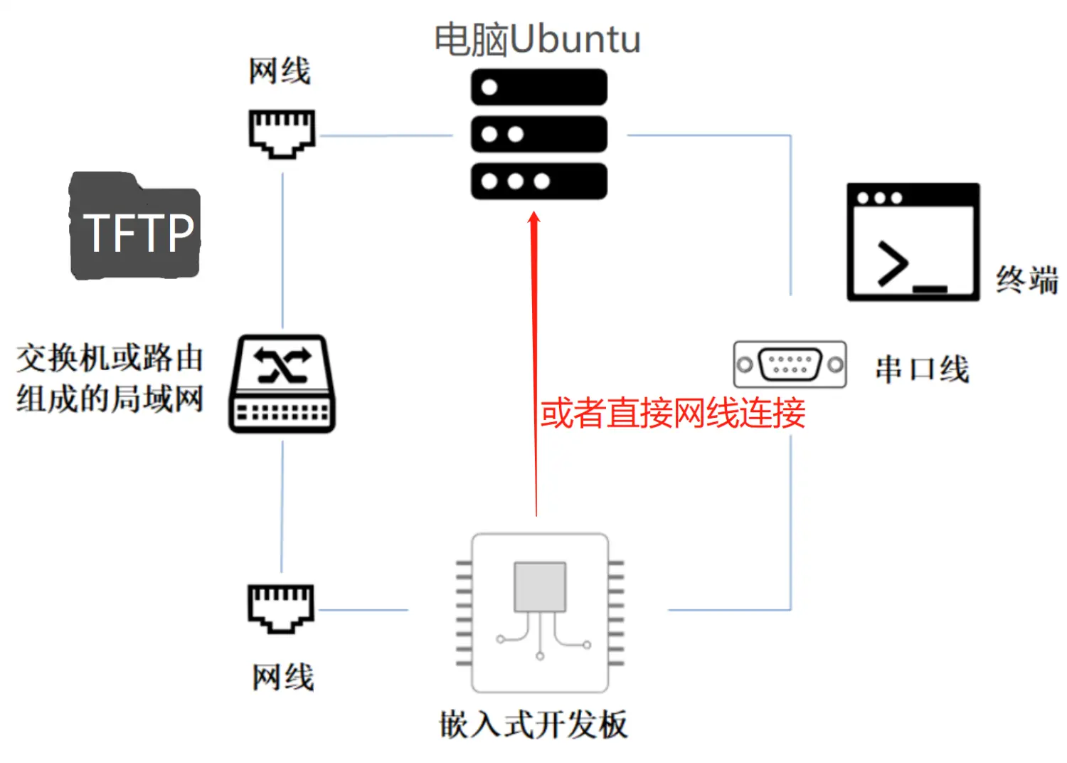 开发板与电脑接入到同一个局域网中,然后电脑提供TFTP服务,开发板通过TFTP与电脑连接共享文件。电脑生成的目标板应用程序放在TFTP的共享文件夹内,开发板访问该文件夹执行应用程序进行测试。