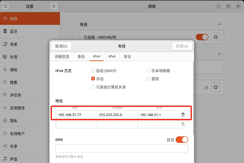 如果原来Ubuntu通过WIFI获取网络的,需要先把Windows的WIFI关掉,重新使用有线网络。
