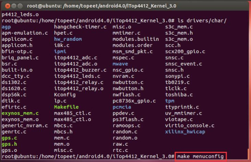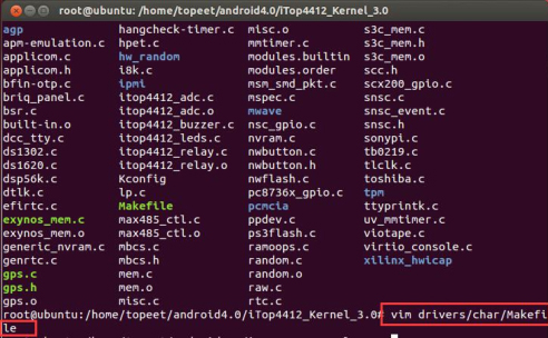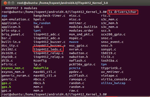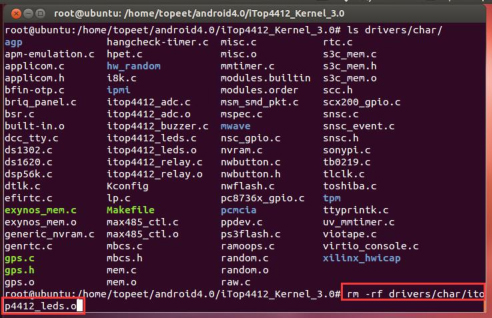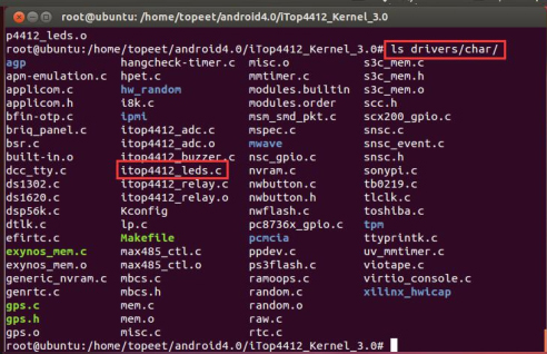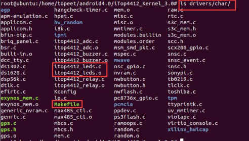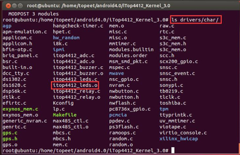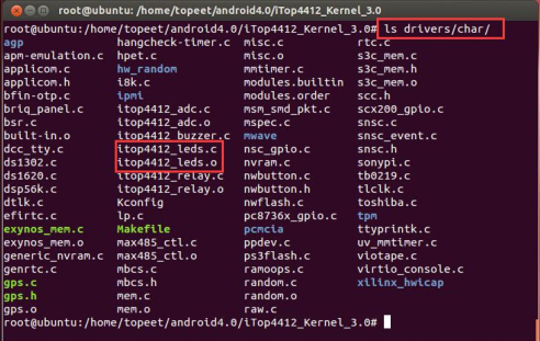 如下图所示,使用命令“ls drivers/char/”查看一下,发现已经没有了“itop4412_leds.o”文件。