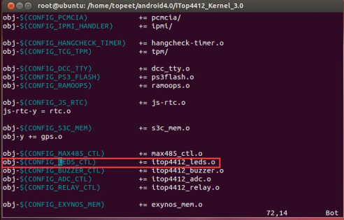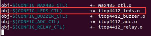 打开“vim drivers/char/Makefile”文件之后,找到和 itop4412_leds.c 相关的文件,搜索“itop4412_leds”,如下图所示。