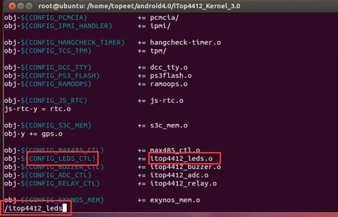 进内核如下图所示,在给大家提供的源码中,解压之后默认状态就有将“itop4412_leds.c”编译进内核的中间文件“itop4412_leds.o”,如下图所示。