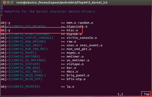 上图中的这一行“obj-y += misc.o”,注意这里需要和内核自带的代码对齐。