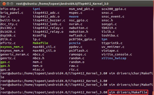 这里不关心 itop4412_leds.c 中的代码,只需先知道 itop4412_leds.c 的文件名即可。在源码目录中使用命令“vim drivers/char/Makefile”,如下图所示。