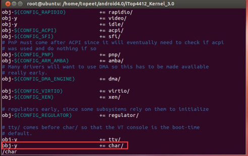 上图中的语法也是很简单,只不过“加等号”右边有文件变为了文件夹。这里表示强制编译当前目录“/drivers”的下一级目录“/char”。在执行编译命令执行到这句的时候,就会先跳转到“/char”目录下的“Makefile”文件。