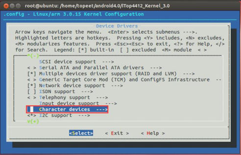如下图所示,进入到“Device Drivers ---> ”选项,找到选项“Character devices--->”。
