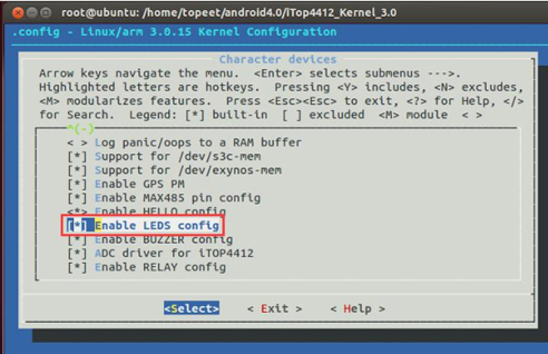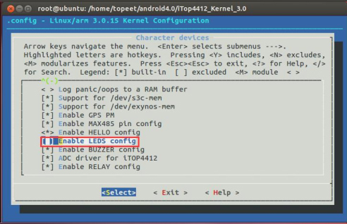 如下图所示,找到选项“Enable LEDS config”,将 LEDS 的配置关闭