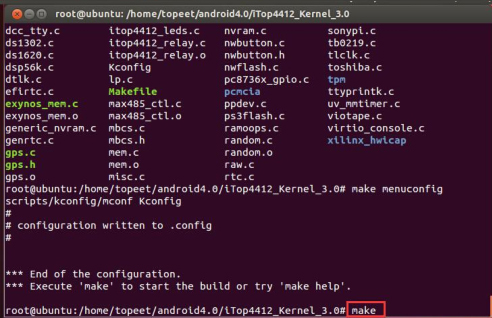 执行编译命令“make”,如下图所示,编译完成之后,使用命令“ls drivers/char/”可以看到“itop4412_leds.o”已经生成。
