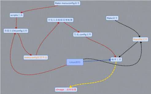 红色的线条表示配置文件 Kconfig 这一部分,在 Kconfig 中要定义针对具体驱动文件的宏变量。然后使用 menuconfig 工具生成新的”,config“文件。