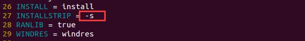 配置完Makefile之后,我们打开config.mak,找到里面的INSTALLSTRIP,删掉后面的-s,如下图所示: