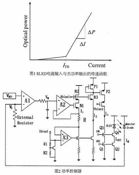 SLED具有电流输入光功率输出的传递函数,如图1所示。当SLED的驱动电流超过ITH,SLED的光功率将正比于驱动电流。因此,该SLED的光功率可以很好地通过控制SLED的驱动电流进行控制。
