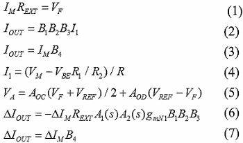 如图2,当系统稳定时,驱动电流IOUT的电流值由外部电阻REXT确定。假定I2/I1,I3/I2,IOUT/I3是B1,B2和B3,那么IOUT 的值可通过改变N2,N3,P1,P2,Q1/Q3和Q2/Q4的值很容易地实现。IM对B4的比值是由所使用的监控二极管的规格确定。REXT和 IOUT之间的关系如(1)至(5)五个方程,其中有6个变量(包括REXT),这意味着REXT与IOUT一一对应,式(6)为传输函数。在公式中,监控电流的变化由式(7)决定: