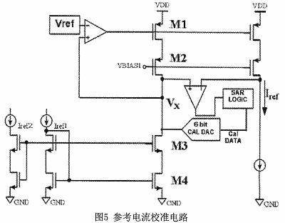 参考电压是由一个简单的一阶补偿电路产生,基于参考电压,所述参考电流产生并在图5校准。它是由一个误差放大器,一个参考电压源,一个比较器,一个逐次逼近寄存器(SAR)的逻辑电路,和一个6位数字-模拟转换器(DAC)组成。