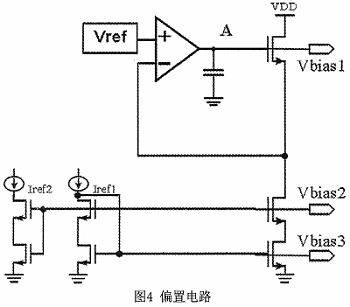所述Vbias1,Vbias2,和Vbias3和由偏置电路产生,如图4所示。通过经典低电压级联结构产生Vbias2和Vbias3,Vbias1由放大器产的。电压被反馈到放大器的负端口,以产生稳定的偏置电压,保持系统的稳定性,一个电容被用于增加点A的阻抗,使得它成为主极点。运算放大器被设计成一个单级级联放大器,这确保了系统更好的稳定性。