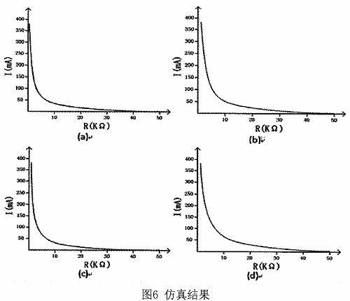 该激光驱动器输出能力的仿真结果示于图6,这是不同条件下的仿真结果图:(a)常温(25℃)下激光驱动器随外部电阻值变化的输出仿真结果;(b)低温 (-40℃)中激光驱动器随外部电阻值变化的输出仿真结果;(c)高温(125℃)中激光驱动器随外部电阻值变化的输出仿真结果;(d)电压4.5V,温度-40℃时激光驱动器随外部电阻值变化的输出仿真结果。通过对在不同条件下仿真结果图的对比可得,该系统能够产生随外部电阻值变化的稳定电流。图中y是外部电阻的值,单位是kΩ,Y0是输出电流,单位mA。