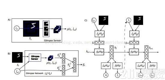 图B是glimpse network,这个网络是以theta为参数,两个全连接层构成的网络,将传感器输出的图像块组和对应的位置信息以线性网络的方式结合到一起,输出gt。